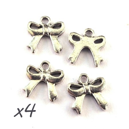 Lot de 4 breloques en forme de noeud en ruban en métal couleur argent vieilli, hauteur 13mm.