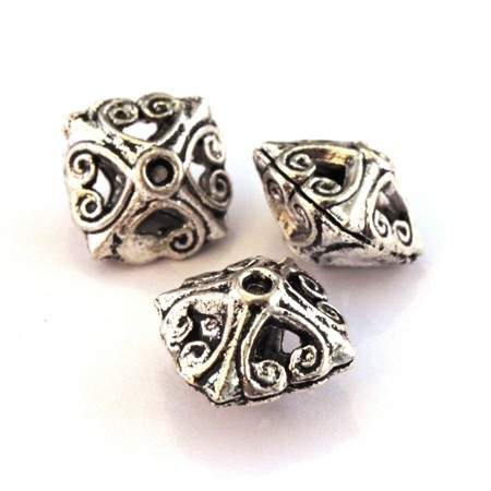 Perle toupie en métal ajouré avec un motif découpé, creuse à l’intérieur. Hauteur 10mm, largeur 13mm, couleur argent vieilli.