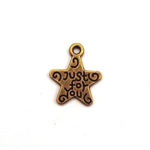 Lot de 5 breloques en forme d'étoile en métal couleur bronze, hauteur 14mm. Motif gravé avec texte 'Just for you'. Breloques recto/verso avec le même motif des deux côtés.