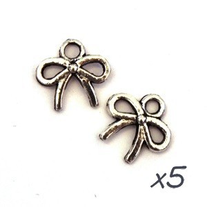 Lot de 5 breloques en forme de petit noeud en ruban en métal couleur argent vieilli, hauteur 10mm.