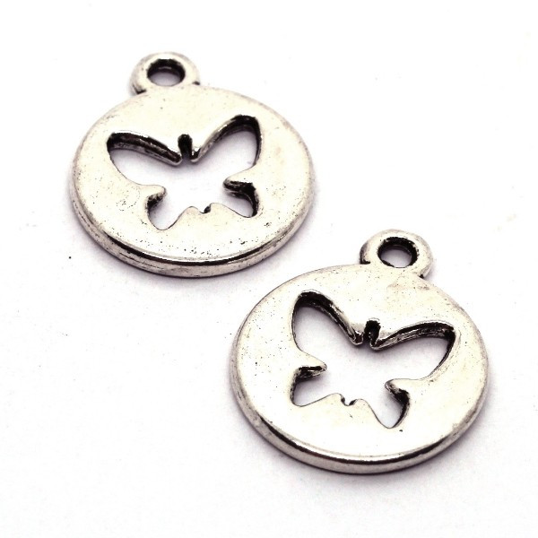 4 breloques en forme de médaillon avec motif papillon découpé en métal couleur argent vieilli, hauteur 21mm.