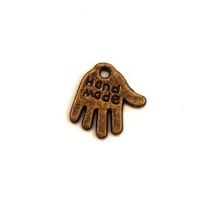Lot de 5 breloques en forme de main en métal couleur bronze, hauteur 13mm. 'HAND MADE' gravé recto/verso.