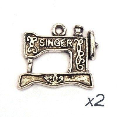 Lot de 2 breloques en forme de machine à coudre marque Singer en métal couleur argent vieilli, hauteur 18mm.
