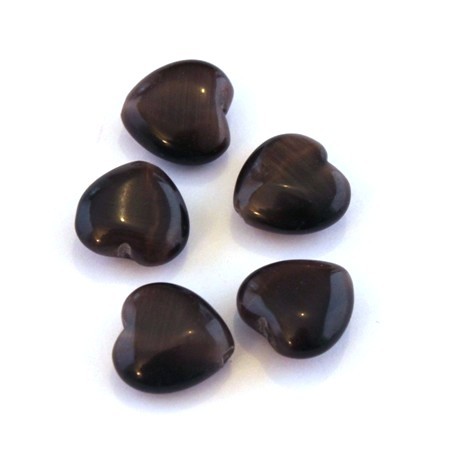Lot de 5 perles oeil de chat en forme de coeur, diamètre 10mm, couleur chocolat (marron foncé). Perles en verre aux reflets changeants.