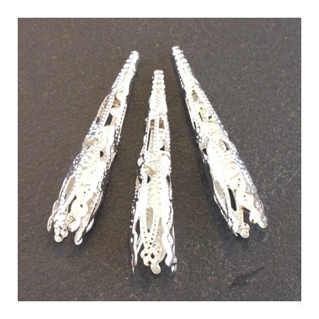 Lot de 6 perles cône filigrané en métal couleur argenté. Perle calotte style gothique avec motif ajouré, hauteur 42mm.