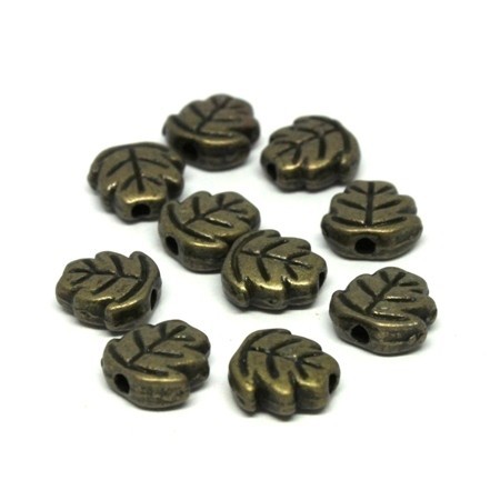 Lot de 10 perles feuille avec motif sur les deux faces, dimensions 7mm x 7mm, en métal couleur bronze.