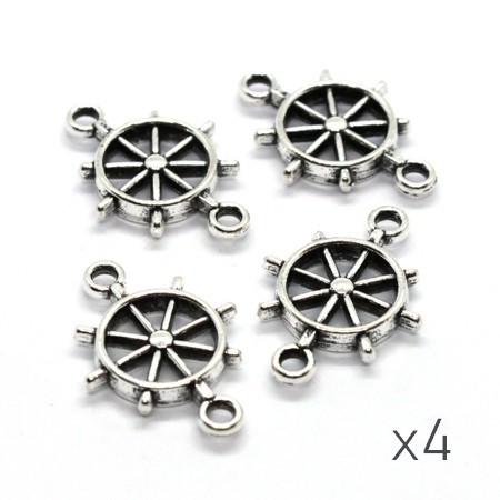 Lot de 4 breloques connecteur en forme de gouvernail en métal couleur argent vieilli. Breloque gouvernail avec 2 anneaux, hauteur 21mm.