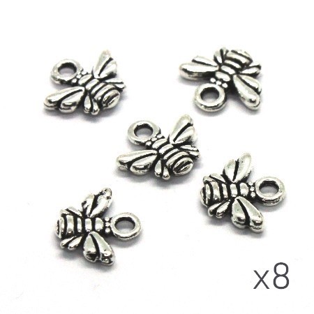 Lot de 8 breloques abeille en métal couleur argent vieilli. Breloques identiques recto/verso, dimensions 10mm x 11mm.