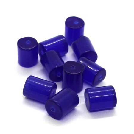 10 perles tube oeil de chat dimensions 8mm x 10mm couleur bleu foncé. Perles en verre aux reflets changeants.