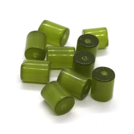 10 perles tube oeil de chat dimensions 8mm x 10mm couleur vert olivine. Perles en verre aux reflets changeants.