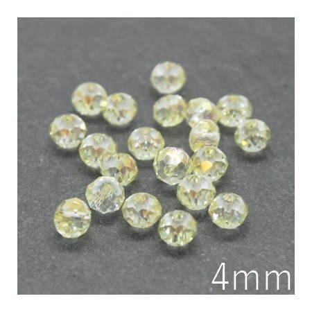 Lot de 20 perles rondelle à facettes diamètre 4mm couleur jaune clair irisé AB. Perles abacus facettées en verre cristal avec une finition irisée.