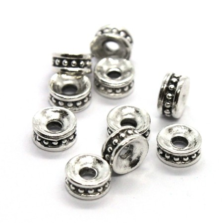 Lot de 10 perles rondelles avec motif points, diamètre 6mm, en métal couleur argent vieilli.