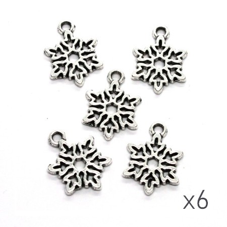 Lot de 6 breloques en forme de flocon de neige en métal couleur argent vieilli, dimensions 15mm x 11mm. Breloques recto/verso avec le même motif des deux côtés.