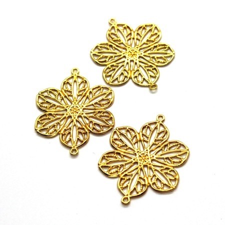 Lot de 4 estampes connecteurs filigrane en forme de fleur avec 2 anneaux de connexion en métal couleur doré, dimensions 20mm x 26mm.
