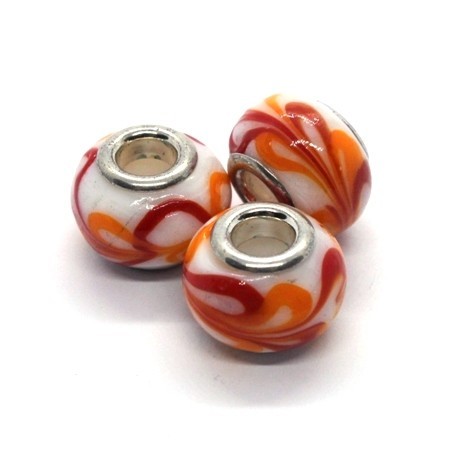 Perle Européenne de style Pandora en verre lampwork couleur blanc et orange avec oeillets en métal couleur argent.