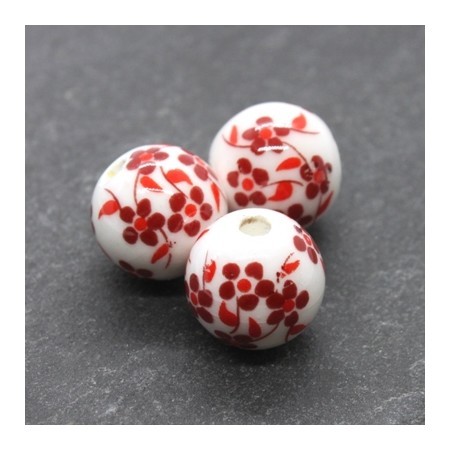 Perle en céramique de forme ronde couleur blanc avec motif imprimé fleurs de cerisier couleur rouge, diamètre 12mm.