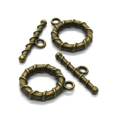 2 fermoirs toggle en métal couleur bronze, motif cordelette. Anneau diamètre 16mm et barre longueur 23mm.