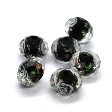 Perle lampwork à facettes couleur noir avec motif fleurs dimensions 10mm x 7mm.
