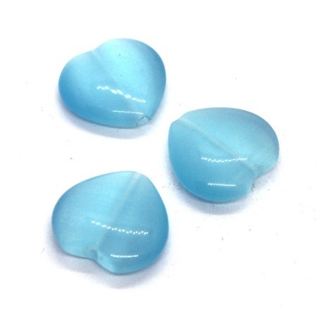 Lot de 3 perles oeil de chat en forme de coeur, diamètre 16mm, couleur turquoise clair. Perles en verre aux reflets changeants.