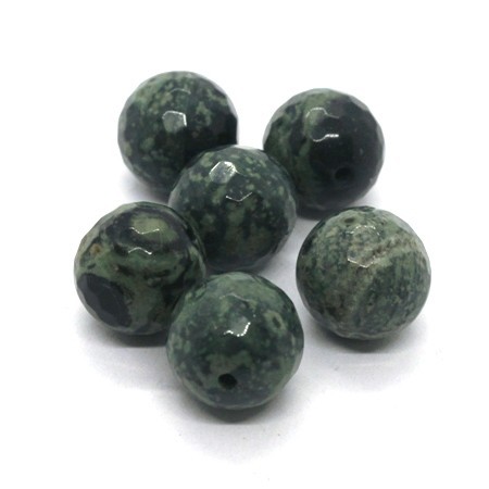 Perle ronde facettée en jaspe vert kambaba, diamètre 12mm environ. Perle ronde taillée à multiples facettes.