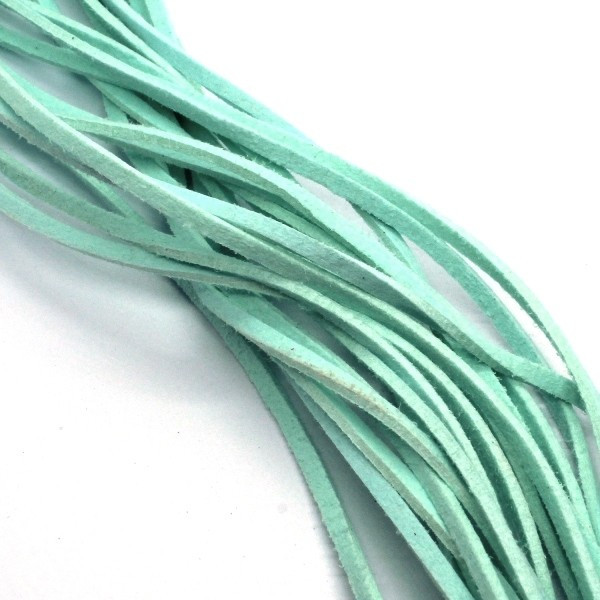 Cordon suédine aspect daim, largeur 2,5mm couleur menthe. Lacet en suédine plat et fin pour colliers et bijoux.