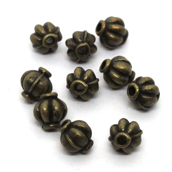 Lot de 10 perles intercalaires en métal couleur bronze, en forme de lampion avec motif strié, dimensions 5,5mm x 6mm.
